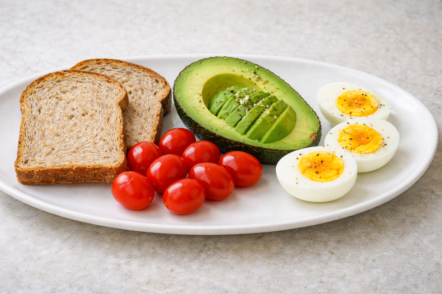 - 간단한 아침 : 통밀빵 1~2조각 + 아보카도 반 개 + 삶은 계란 2개 + 방울토마토 한 줌
