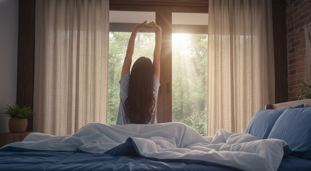 밤에 커튼을 치고 잠드는 분들이라면 커튼을 약간 열어두면 아침 햇살이 자연스럽게 방 안으로 들어옵니다. 이 빛이 눈꺼풀을 통해 감지되면 우리 뇌는 서서히 각성 모드로 전환됩니다. 만약 방의 위치상 아침 햇빛이 들지 않는다면, 일출 시뮬레이션 조명을 사용하는 것도 좋은 방법입니다. 이 조명은 설정한 시간 30분 전부터 서서히 밝아지면서 자연스러운 기상을 돕습니다.