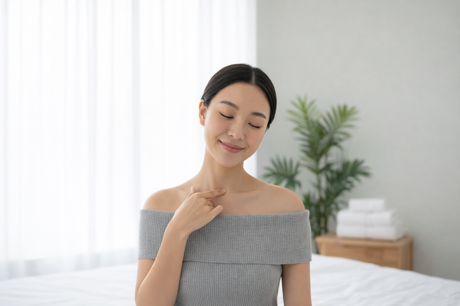 마사지를 할 땐 양쪽을 손가락 끝으로 아주 부드럽게, 원을 그리듯 10~20회 마사지합니다. 안쪽에서 바깥쪽으로 살며시 밀어낸다는 느낌으로 해주세요. 이곳을 먼저 열어주는 것이, 전체 림프 순환의 시작점이 됩니다.